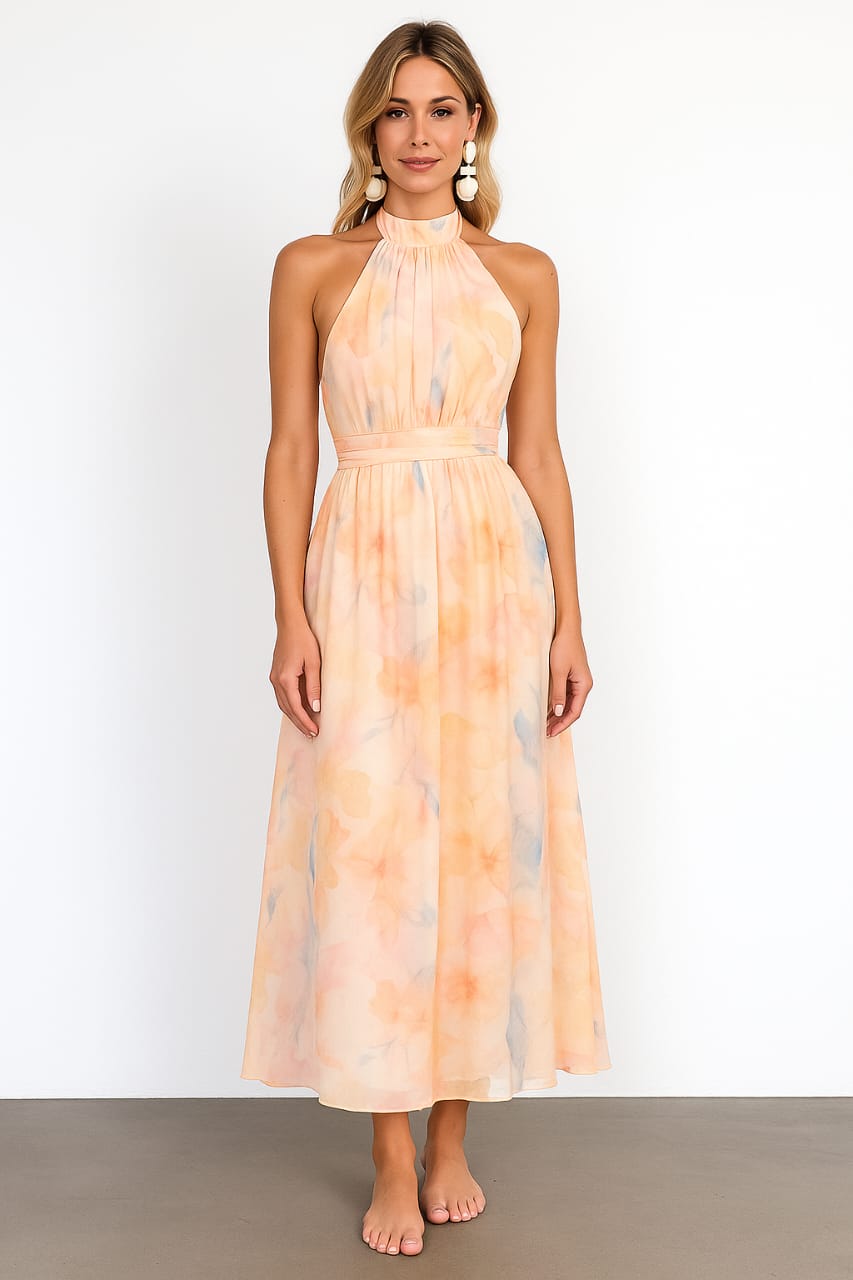 This flowy halter dress captures the softness of summer skies with a flattering waist and breezy silhouette. Designed to make you feel light, elegant, and ready for compliments.